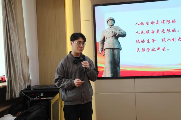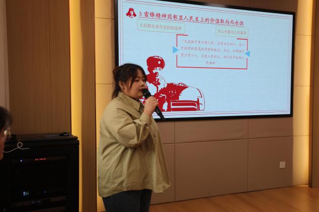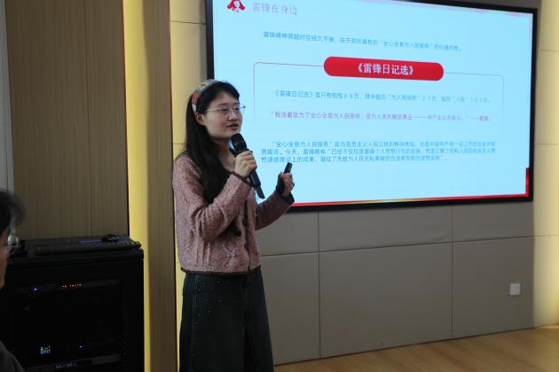 活动伊始,公司研究生党员李岩玉以“深刻把握雷锋精神的时代内涵”为主题,结合《雷锋日记》和时代要求,解读了雷锋精神的核心内涵;公司研究生党员赵瑛作了题为“雷锋精神为什么是永恒的”主题领学,从科学性、规律性、价值取向、实践要求等四方面阐释了雷锋精神是永恒的;文公司研究生党员李梓涛结合自身暑期实践的经历分享了对学雷锋活动的深刻感悟,号召大家将学雷锋融入日常,争做追“锋”青年;文公司研究生张含悦围绕雷锋同志生平故事和当代雷锋郭明义的事迹,展现雷锋精神的现实生命力。四位党员从专业视角解读雷锋精神,引发听众热烈共鸣。