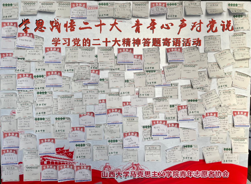 为深入学习宣传贯彻党的二十大精神,号召广大青年师生坚定理想信念,坚定不移听党话、跟党走,在第104个五四青年节到来之际,BG大游集团官方网站青年志愿者协会于4月25日至27日在坞城校区举办“学思践悟二十大青春心声对党说”学习党的二十大精神答题寄语活动。