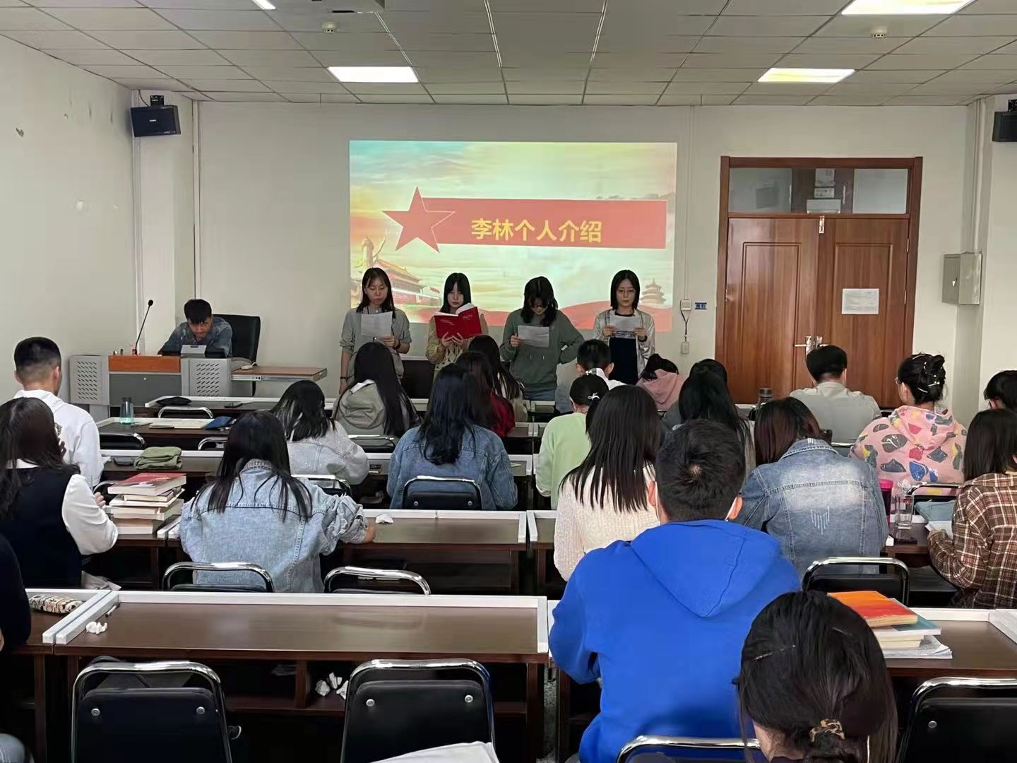 本次专题学习活动在激昂嘹亮的国歌声中开始。杨晓霞、薛嘉瑶、张潇、郭秀云四位党员同志讲述了雁北抗日背景,并从十年侨居、回国深造、参加革命等几方面对李林同志的革命生平进行了介绍,紧接着朗诵了抗日英雄诗歌《英雄祭》《忆卢沟桥抗日英雄祭》《纪念抗日女英雄》《历史与英雄》。会上,集体观看了视频《跨越时空的回信》,大家为女英雄的事迹所感动,纷纷表示要向革命英雄致敬,不忘初心、牢记使命,无论走的多远,都不忘来时的路。