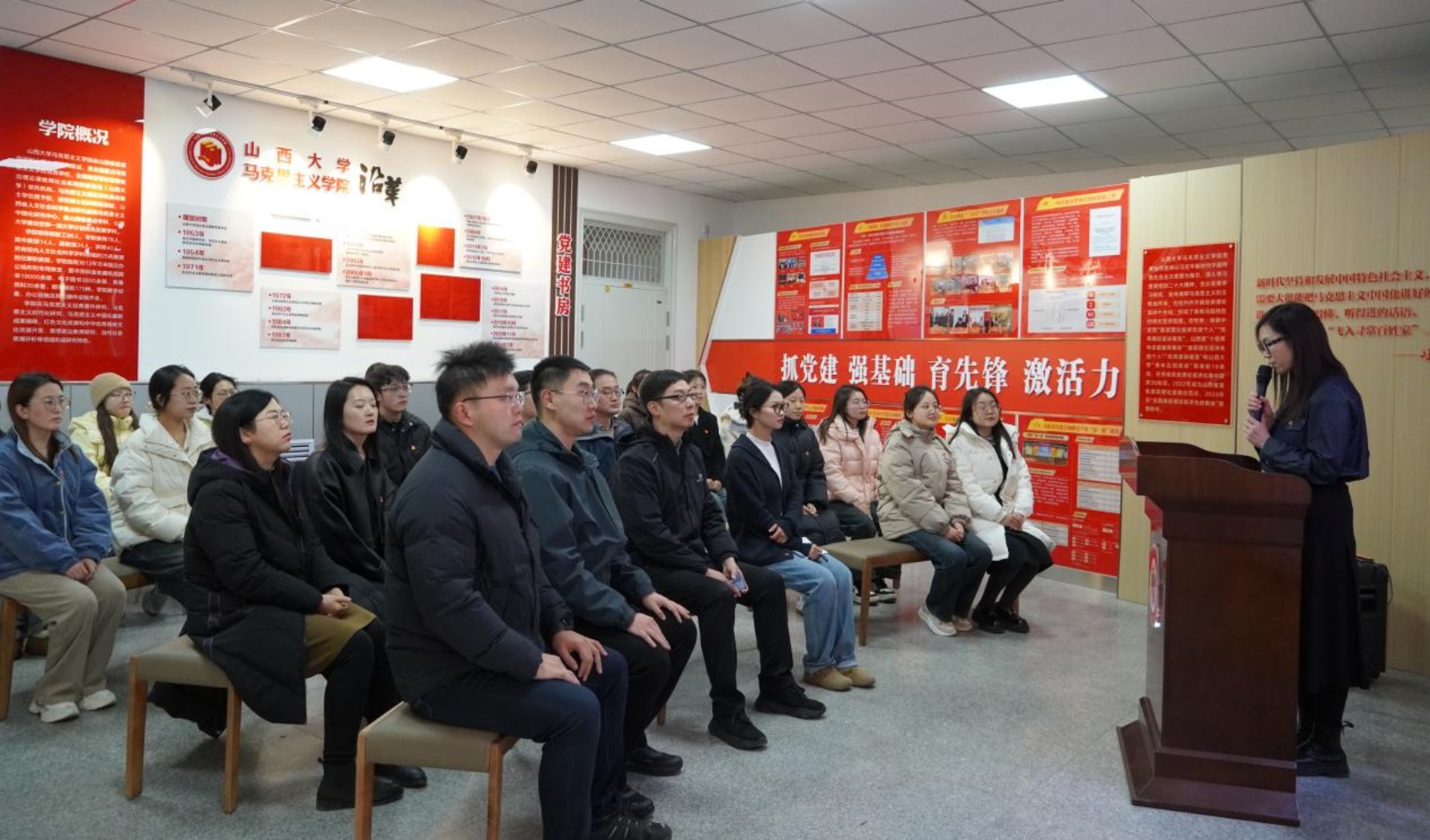 领学环节,教师第四党支部翟昕老师围绕山西省红色文化地图,分别以山西中部、北部、东部、西部、南部地区为轴线,介绍了山西不同地区红色资源的分布和红色文化的特点,讲解了山西红色文化的重要意义和特殊地位,号召大家响应习近平总书记号召,把红色资源利用好,把红色传统发扬好,把红色基因传承好。研究生第二党支部副书记李博玮领学了习近平总书记关于用好红色资源、赓续红色血脉的重要论述,表示红色文化资源是中华民族的宝贵财富,广大师生党员要用心用情用力保护好、管理好、运用好红色资源,大力弘扬红色文化,从中汲取昂扬奋进、团结拼搏的精神动力。