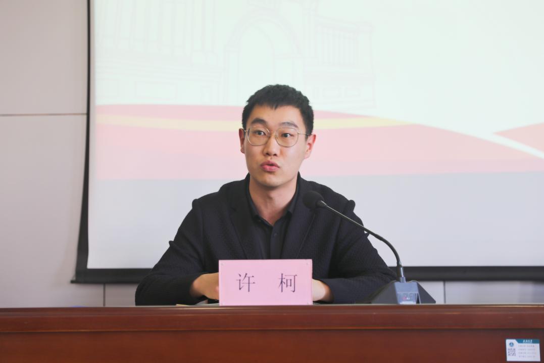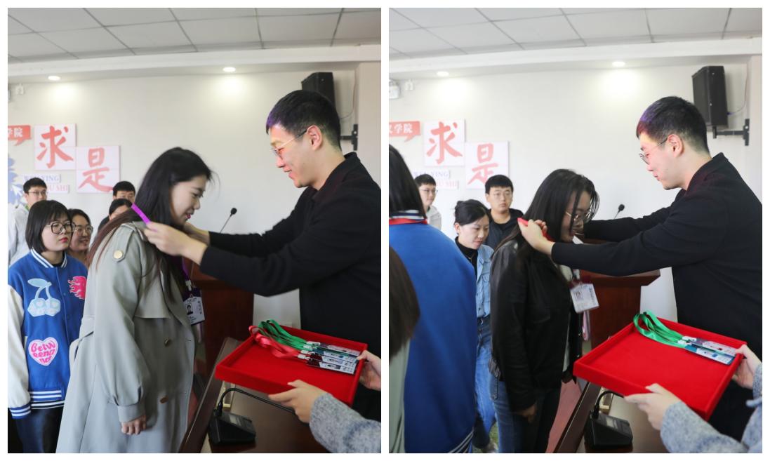 许柯对近期各团学组织开展的工作给予肯定,同时对本学期的工作做出详细的部署和指导,并寄语团学组织成员在日常工作中积极学习经验、找准自身定位、合理规划未来,坚守初心,砥砺前行。随后,许柯为团学组织新成员代表佩戴了工作牌。