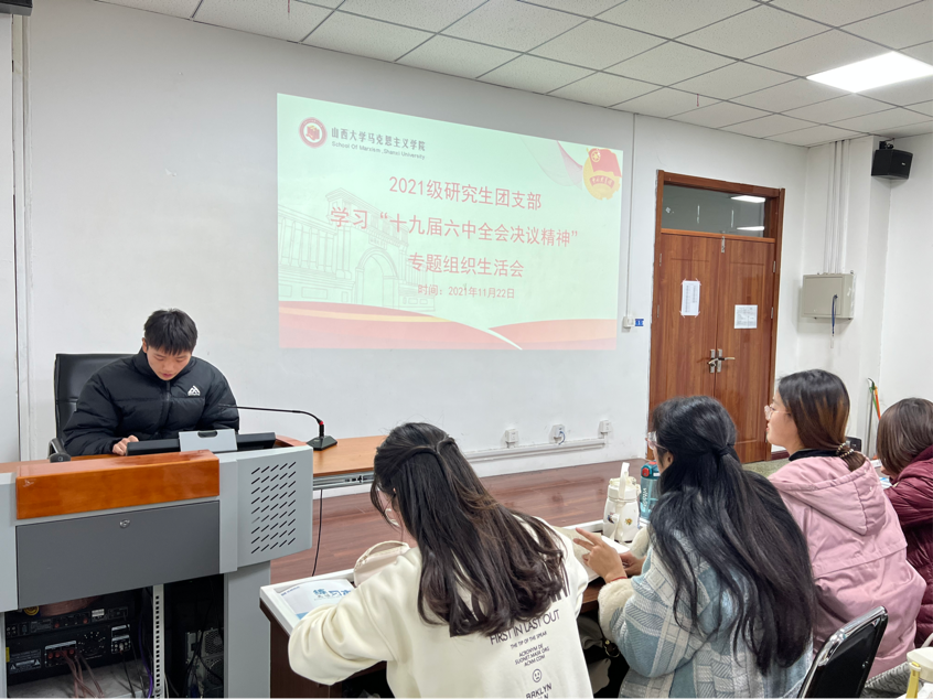 11月22日,BG大游集团官方网站2021级研究生团支部在一教室开展“学习十九届六中全会精神”专题组织生活会。会议由2021级研究生团支部书记李毅博主持,2021级研究生团支部全体团员参加。