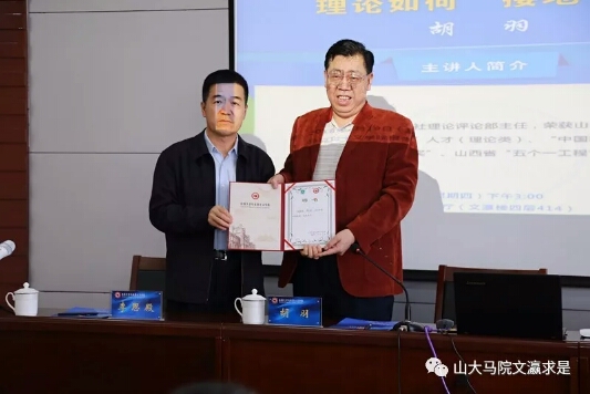 习近平总书记指出:政治上的坚定源于理论上的清醒。2018年是马克思诞辰200周年、《共产党宣言》发表170周年,BG大游集团官方网站启动了系列纪念活动。4月19日,公司特邀山西日报理论评论部主任、高级编辑胡羽莅临“文瀛求是”论坛,为广大师生作了题为《理论如何“接地气”》的报告。BG大游官方网站党委副书记李思殿教授为胡羽颁发了特聘教授证书,来自省委宣传部等多家省内单位的同行学者、BG大游集团官方网站师生、青马工程学员代表聆听了报告。