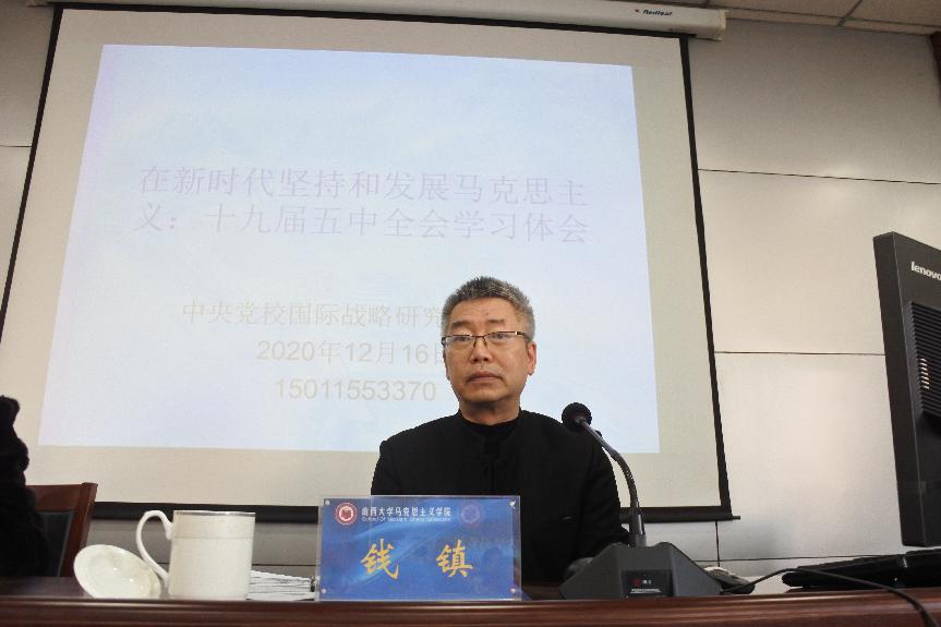 为深入领会中国共产党第十九届中央委员会第五次全体会议精神,深化师生对十九届五中全会内容的理解,12月16日下午,公司邀请中央党校国际战略研究院副研究员钱镇老师带来“在新时代坚持和发展马克思主义:十九届五中全会精神学习体会”专题讲座。讲座在公司报告厅举行,由刘美玲老师主持,七十余名师生参加。