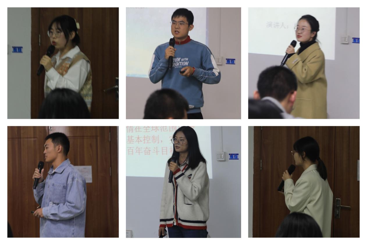 本次比赛共有18名同学参赛,选手们根据赛前的抽签顺序,分六个小组依次进行演讲。选手们选题内容丰富,角度新颖,申思淼同学的《思政之“盐”融入课程之“汤”》、康佳同学的《周恩来精神对新时代青年的价值探析》、王思扬同学的《马克思对鲍威尔政治解放的批判与超越》、杨梦珍同学的《马克思,靠谱!》、刘宇轩同学的《马克思主义永葆生机活力的奥秘》、张泽琨同学的《国共第一次合作的思想基础》、程紫薇同学的《警惕“黑天鹅”,防范“灰犀牛”》、侯文潇同学的《实践是检验真理的唯一标准》、刘昶同学的《马克思学说的整体性解读——基于异化劳动概念》、申康凯同学的《从<欧也妮·葛朗台>中解读当时西方社会的异化现象》等,都给大家留下了深刻的印象。选手们演讲思路清晰,分析视角新颖,把马克思主义理论与社会热点、现实实践有机结合了起来,现场掌声不断。
