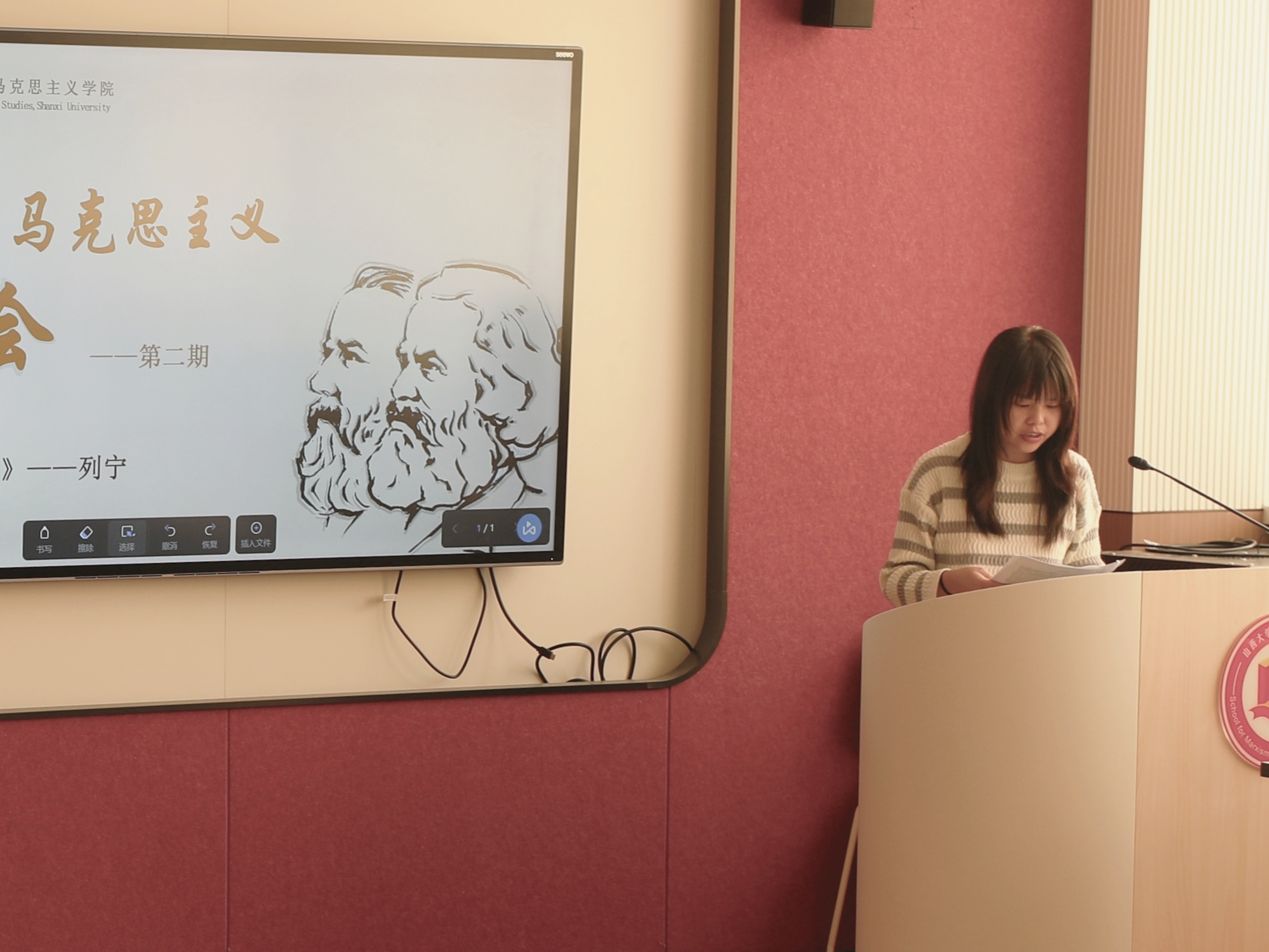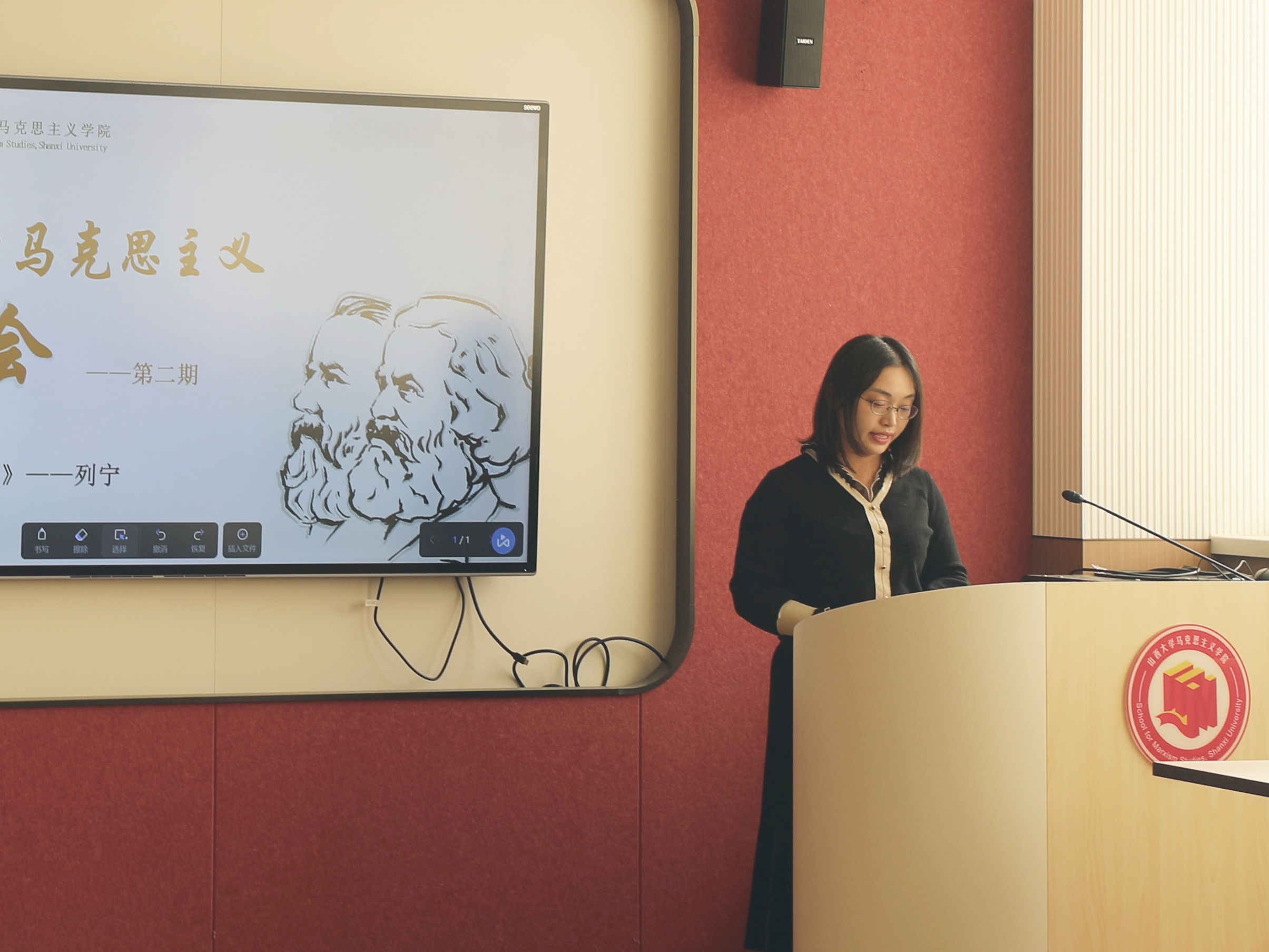 之后,唐文佩和徐佳君老师对三位同学的读书报告进行了精彩点评。唐文佩老师肯定了三位同学对列宁这一著作的探讨,认为同学们能够对照同一概念的不同语言版本开展词频研究,是非常值得鼓励的方法创新,希望大家在读书过程中充分吸取和梳理前人的研究成果,选取特定问题做更加深入细致的阅读和研究。徐佳君老师肯定了三位同学以问题为导向的学习成果和问题梳理成果,希望同学们在研读经典的同时要有意识地关联现实,从中汲取启示,更好地用马克思主义基本原理解释现实理论问题。