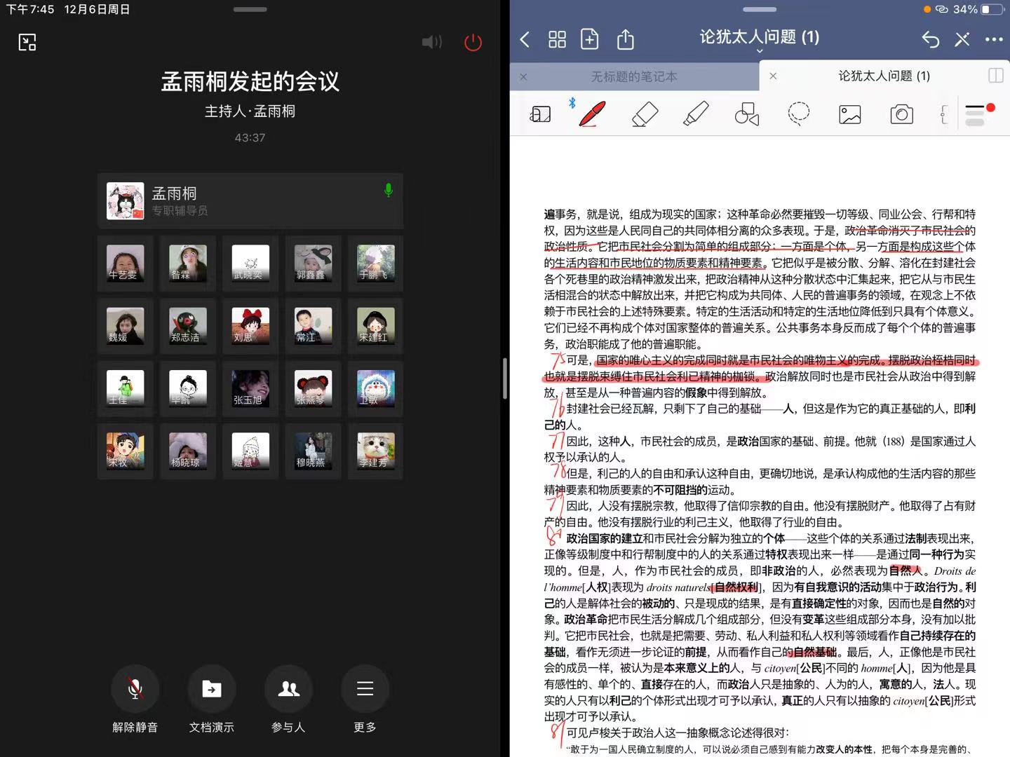 接下来于鹏飞同学围绕《论犹太人问题》第二部分内容,从马克思反对鲍威尔“要获得普遍人权就必须牺牲信仰的特权”的观点出发,引出政治生活和市民生活之间的矛盾关系,最终回到什么才是人的解放这一根本问题上。孟老师就上述内容,结合《德意志意识形态》《关于费尔巴哈的提纲》等著作和热点时政,对谋求政治解放的人在理论上和实践上的矛盾等关键问题作了分析并提出了自己的看法,澄清马克思的结论:资产阶级政治解放中所谓的人权终究是自私自利的权利,而这与人的解放的要求是相悖的,人的解放不是人类中解放出来,只有从自私自利的冲动中解放出来才是真正的解放。
