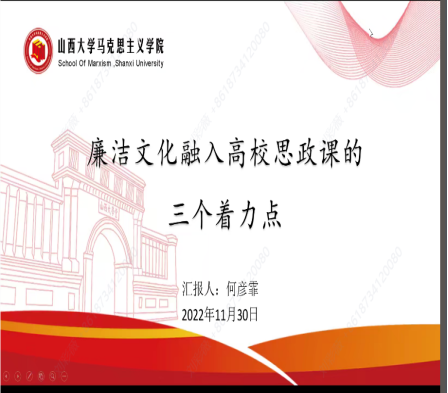 BG大游集团官方网站8位教师围绕主题分别进行交流发言。程学军作以“新时代中国特色反腐败理论的逻辑意蕴”为题,介绍了新时代中国特色反腐败理论的渊源、科学内涵和时代特征。逯慧以“新时期提升青年员工法治素养的思考”为题,从编辑法律条文参考资料、汇总法律案例教学资源、保障法律实践有序推进等三个方面提出具体对策。何彦霏以“廉洁文化融入高校思政课的三个着力点”为题,强调廉洁文化融入高校思政课的三个着力点在于价值着力、内容着力和路径着力。刘惠惠以“中华优秀传统文化中的廉洁思想研究”为题,认为中华优秀传统文化中的廉洁思想与我们今天为之奋斗的社会主义政治文明与廉洁文化建设有着深刻的历史联系,需要继承和弘扬。赵亚男以“马克思主义劳动原理视阈中腐败的根源和特征”为题,指出腐败现象在本质上是剥削制度和剥削阶级的产物,剥削劳动人民成果是腐败的重要体征,腐败是劳动走向完全解放的“寄生毒瘤”。冀鹏作以“全面建设清廉山西的实践理路”为题,从实践基础、动力机制、制度体系、关键行动等四个方面介绍了山西清廉建设的实践理路。邓韬作题以“改革开放以来中国反腐败斗争的矛盾演进”为题,详细介绍了改革开放以来腐败问题的阶段划分及各阶段腐败问题的特征和举措。郭玉龙以“历史、趋势与现实:中国百年公证史的回顾与反思”为题,介绍了中国百年公证史的历史与现实,指出要认真挖掘其中有价值的、可利用的廉洁元素,有效运用到思政课教学中。