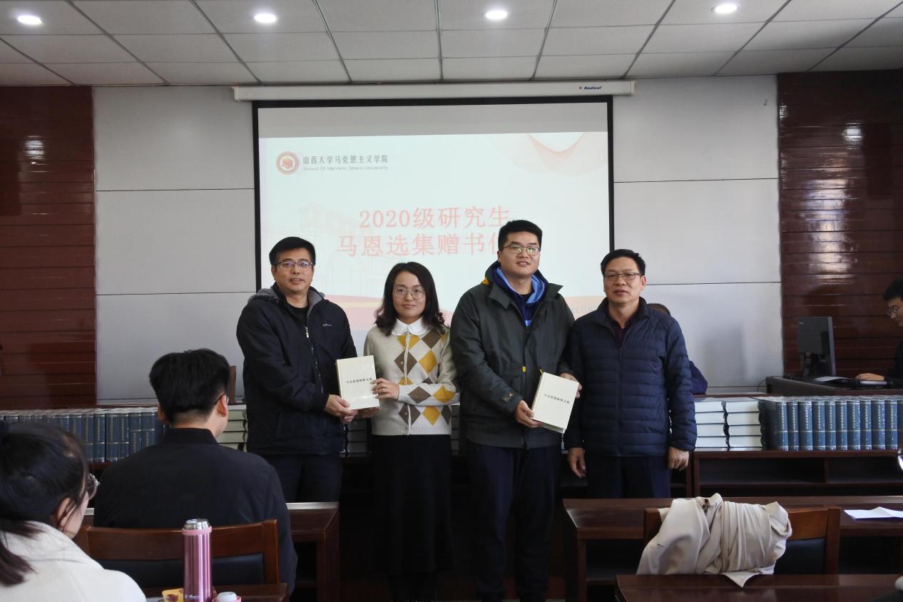 活动第二项,由韩书保、张守夫、石海红、谢忠强分别为2020级博士研究生、硕士研究生代表赠书,并合影留念。