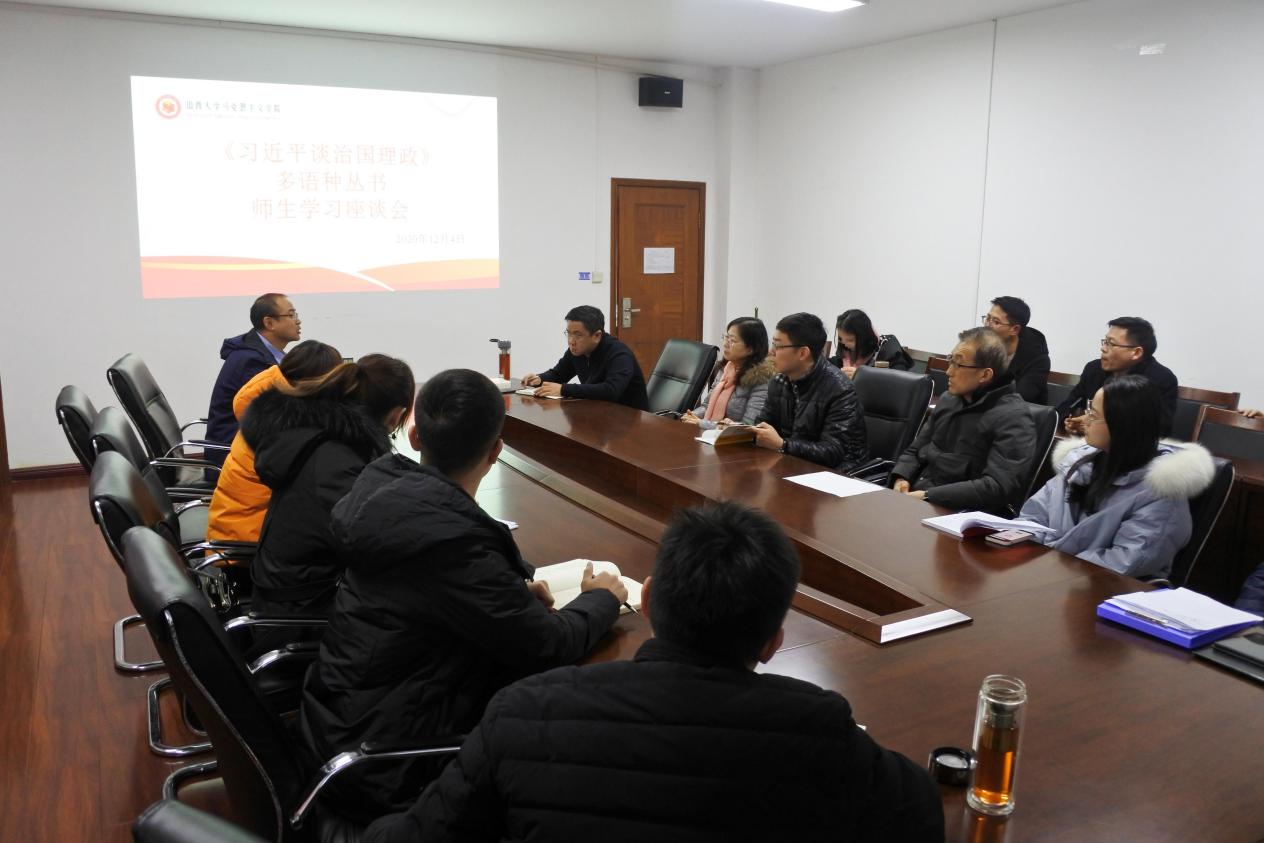 12月4日下午,BG大游集团官方网站《习近平谈治国理政》多语种丛书师生学习座谈会在公司会议室举行,公司青年骨干教师、博士、硕士研究生代表参加了本次座谈会。会议由BG大游集团官方网站副经理谢忠强教授主持。