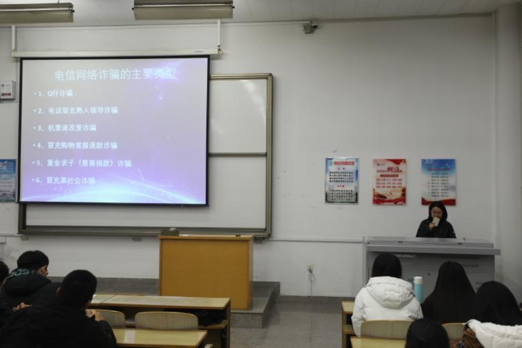 孟雨桐老师结合近几年校内发案情况,为同学们讲解了电信诈骗的6种主要类型、诈骗形式以及各自的特点,并讲解了具体的防范措施和办法,告诫同学们不仅要注意保护自己的隐私,而且要学法、知法、守法、用法,真正做到防患于未然。