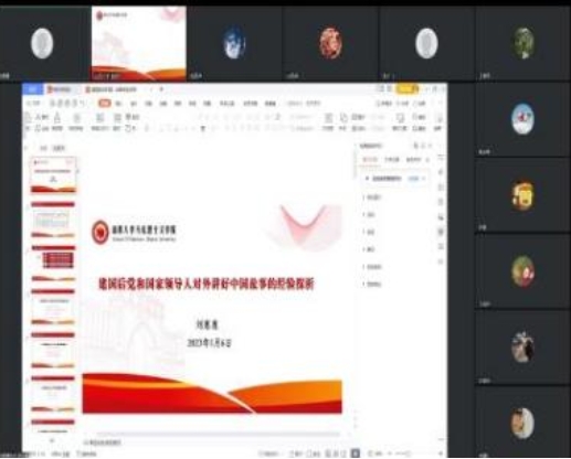 习近平新时代中国特色社会主义思想概论教研室讲师刘惠惠以《建国后中国共产党人对外讲好中国故事的经验探析》为题,分析了建国后党和国家领导人对外讲好中国故事的出发点、故事内容、语言风格及经验启示。王树荫教授和胡英泽教授就选题范围、研究内容与方法等方面对该报告提出了宝贵建议,并强调开展该研究需要注意历史分析、把握好分类,要有细腻的层次感。