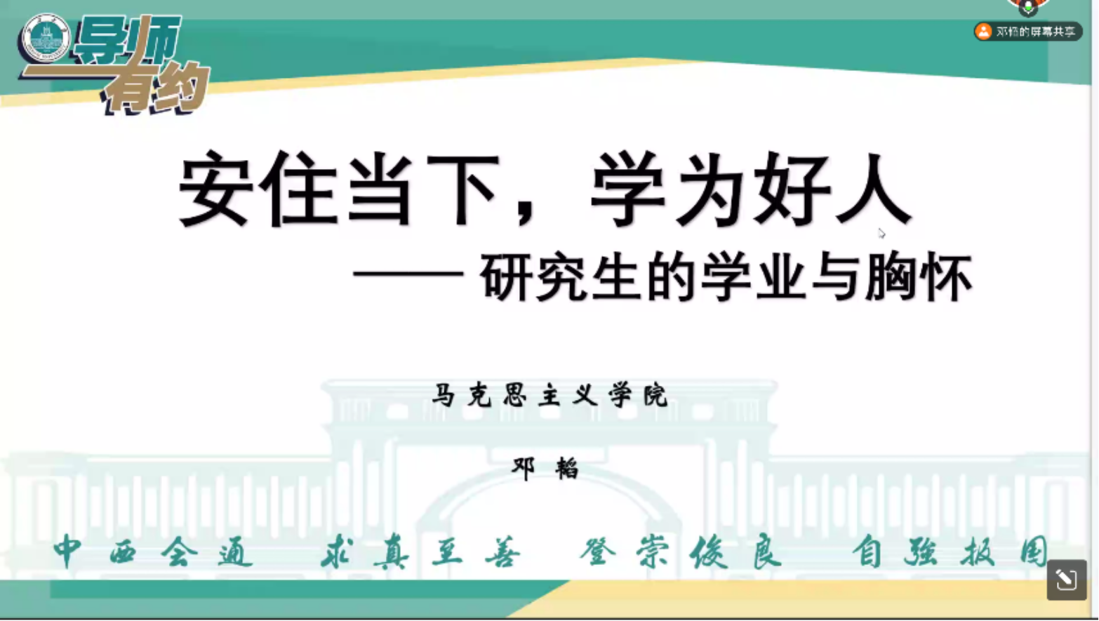 7月5日,BG大游集团官方网站“导师有约——师生携手,共话成长”第九期活动在线上举行,邓韬老师以“安住当下,学为好人——研究生的学业与胸怀”为题与研究生展开交流,共同探讨研究生应具备的能力与胸怀。