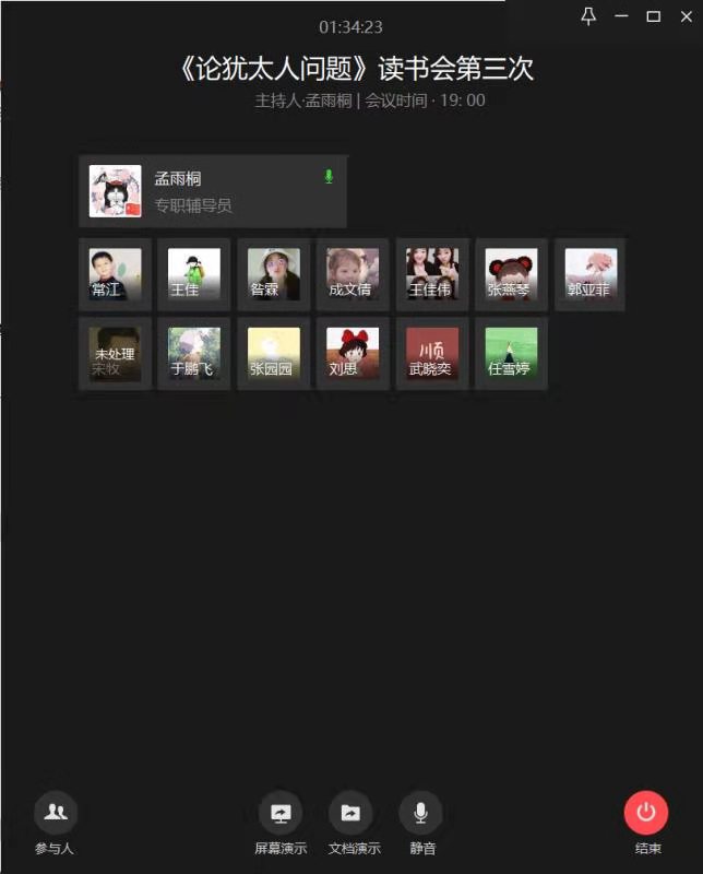 接下来孟老师就“如何理解犹太人用自己的方式自我解放”、“犹太精神”、“犹太人的法律”、“人如何从经商谋利中解放出来”等重点问题和大家交流了自己的看法。同时,她推荐同学们参考韦伯的《新教伦理与资本主义精神》,同学们就新教教义如何为私有财产的神圣性辩护”以及“西方国家的双重标准问题”问题展开交流讨论。活动气氛热烈,大家深受启发。