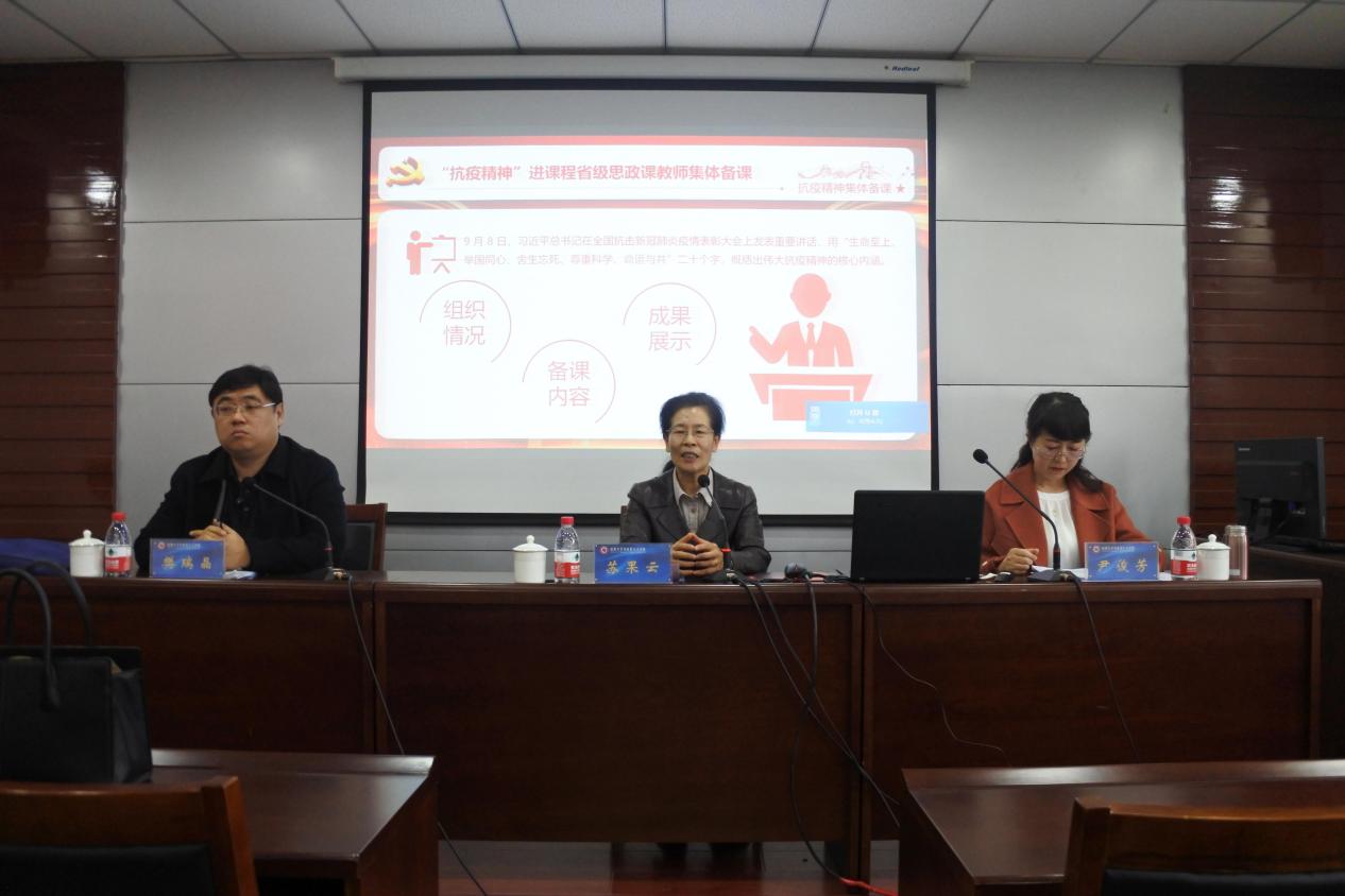 随后由樊瑞晶教授对《马克思主义基本原理概论》课程备课情况进行交流,樊教授首先指出,思政课不同于其他一般专业课,它彰显着极强的政治属性,思政教学必须要达到政治性和学理性的相统一。樊教授从“抗疫精神”整体的理论逻辑、历史逻辑和价值尺度三个方面出发,强调集体备课的初衷就是夯实基础、博采众长,“抗疫精神”要点对点融入原理课,不仅要把理论基础夯实到位,更要把新思想、新理念、新内容传授到位。