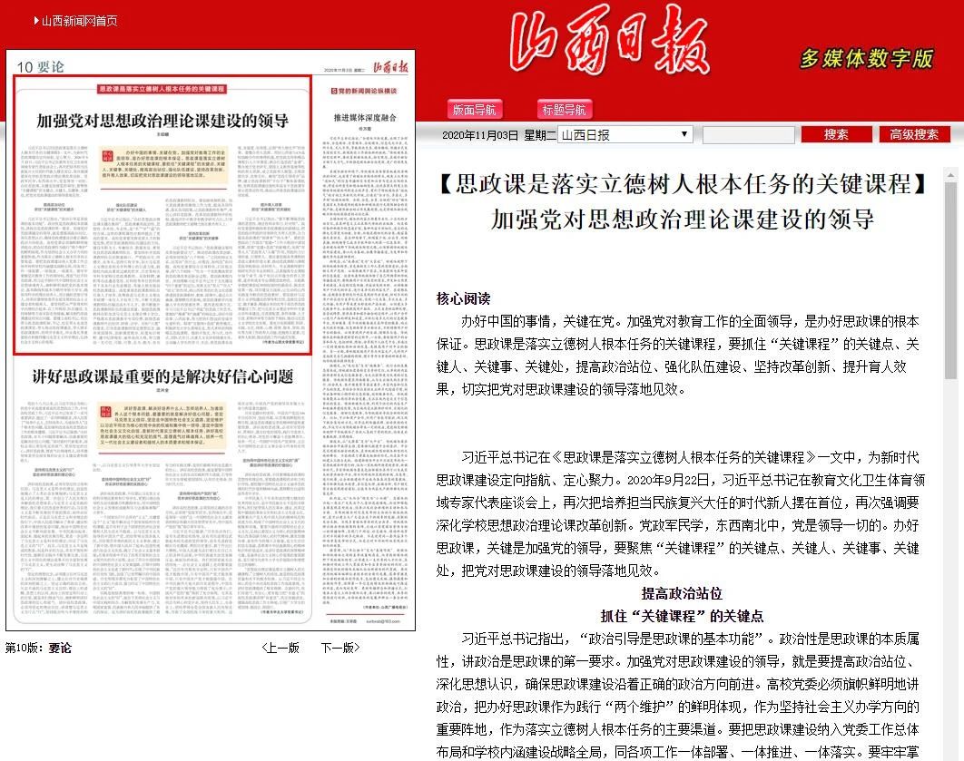 11月3日的《山西日报》要论版刊发了公司党委书记王仰麟教授署名文章《加强党对思想政治理论课建设的领导》,现全文转发。