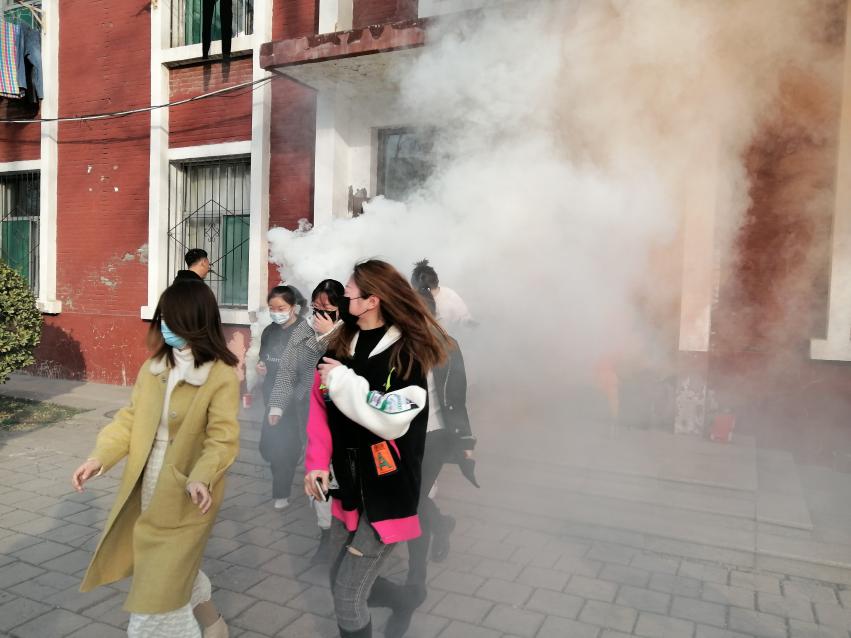 随后,演练活动正式开始。从烟雾开始扩散到拉响警报,再到最后一名同学从烟雾中成功逃生,同学们相互配合,听从指挥,秩序井然有序,成功完成了消防疏散演练。韩勇老师对演练作出点评,肯定了同学们的正确做法,对不正确的疏散行为进行了指正,并在现场为同学们详细讲解和展示了干粉灭火器和自救呼吸机的使用方法,确保每一位同学都能够熟练掌握。